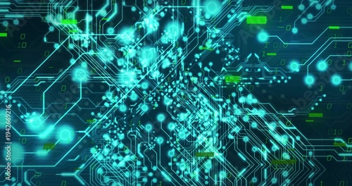 Fototapeta premium Showing central glowing cyan circuit network pulsing across dark gradient with nodes, flares binary