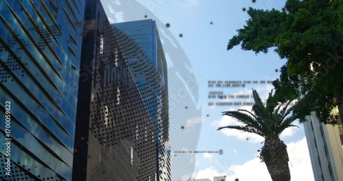 Naklejka premium Showing central skyscraper standing on downtown street, with slatted facade, palm tree, dark dots
