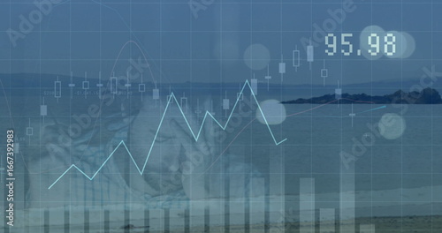 Fototapeta premium Showing chart overlay over beach, featuring candlestick bars line graph...