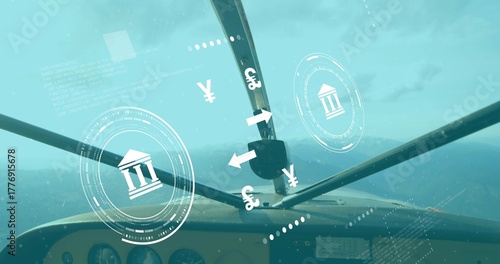Fototapeta premium Showing cockpit panel and windshield struts flying over mountain peaks, with HUD financial icons