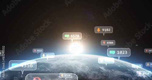 Obraz premium Showing curved Earth horizon glowing at sunrise in low Earth orbit, with UI bubbles showing icons