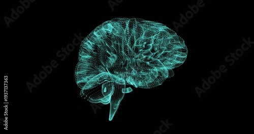 Naklejka premium Showing 3D cyan brain wireframe in black void, featuring glowing nodes, gyri, cerebellum, brainstem
