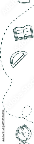 Naklejka premium Showing dashed line linking pen nib icon open book, protractor, globe on transparent background