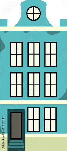 Fototapeta premium Showing flat design facade on transparent background, featuring circular window, door, teal steps