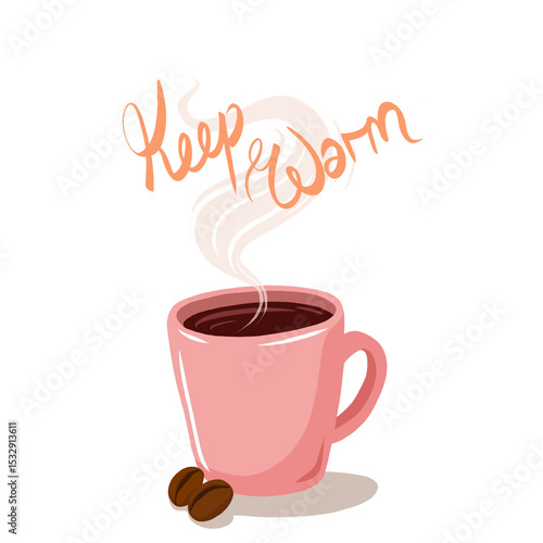 Obraz premium Showing flat design pink mug with coffee beans and steam text Keep warm on...