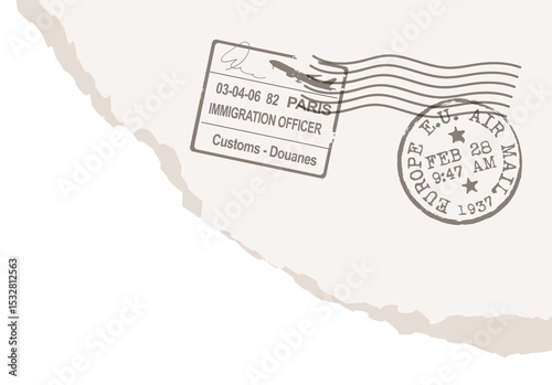 Obraz premium Showing flat torn paper corner with EU Air Mail and Paris customs stamps,...
