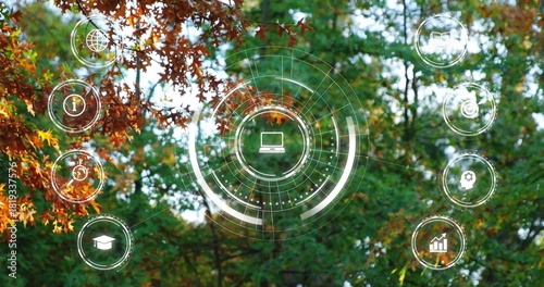 Fototapeta premium Showing futuristic circular HUD overlaying autumn forest canopy, with laptop icon plus edge icons