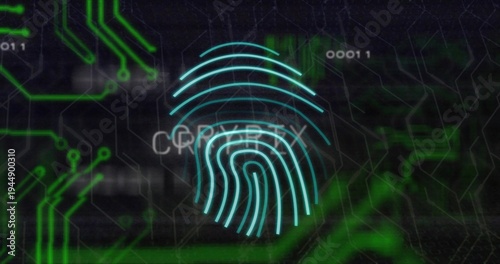Fototapeta premium Showing glowing-cyan fingerprint-hologram on system UI hex-mesh neon-traces CRYPTO00011 scan-flares