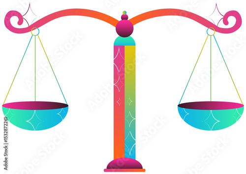 © vectorfusionart, Fototapeta premium Showing gradient balance scale with beam and hanging pans, sparkly stars on transparent background