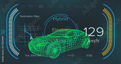 © vectorfusionart, Obraz premium Showing green wireframe car model on grid at HUD, with speedometer gauge and drive-mode selector