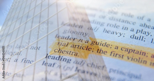 © vectorfusionart, Fototapeta premium Showing highlighted dictionary entry 'leader' reflecting skyscraper facade over desk surface