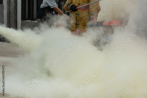 Fototapeta premium Showing how to use a fire extinguisher on a training fire for employees industry.Firefighter working on the fire site.Fire fighter concept.