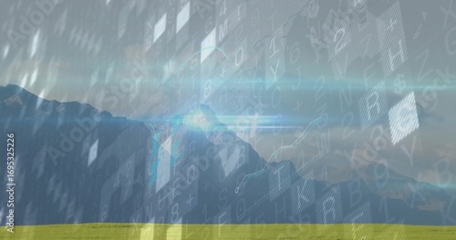 © vectorfusionart, Obraz premium Showing mountain peaks rising above grassy meadow under blue sky featuring code overlay and flares