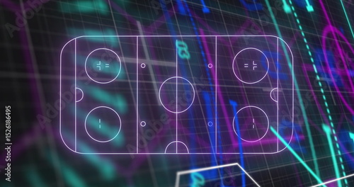 Fototapeta premium Showing neon air hockey rink glowing over dark grid dashboard, with neon graphs and data labels