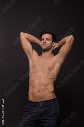 © HD92, Fototapeta premium showing off silly young man nude shirtless abs portrait studio
