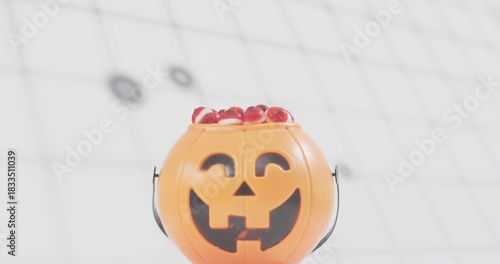 Naklejka premium Showing orange pumpkin bucket with face, black handle spilling red candies under ceiling grid