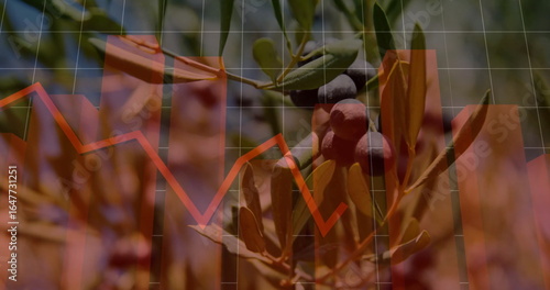 © vectorfusionart, Naklejka premium Showing ripe olive branch reflecting market changes in orchard, with translucent financial chart