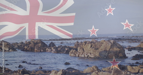 © vectorfusionart, Fototapeta premium Showing rocky shoreline at low tide with jagged rocks in calm water, New Zealand flag overlay