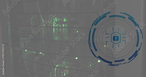 © vectorfusionart, Obraz premium Showing server rack with mesh door, cooling fans, green LEDs and security graphic, copy space