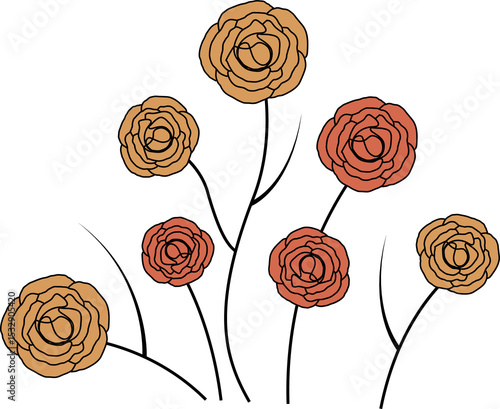 Obraz premium Showing seven yellow or coral stylized flowers on black stems in flat vector, transparent background