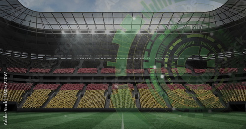 Obraz premium Showing stadium interior with lined grass pitch and block seats under glass roof, green HUD overlay