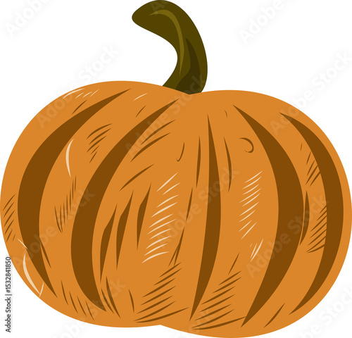 © vectorfusionart, Obraz premium Showing stylized pumpkin with deep ribbing and curved green stem on transparent background