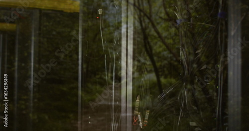 Fototapeta premium Showing tangled black cables behind glass cabinet at forest with zip-ties reflection, copy space