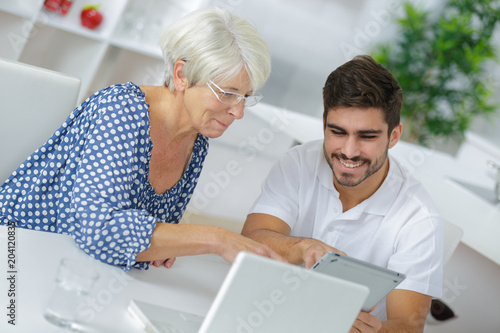 © auremar, Obraz premium showing the elderly mother how to use the tablet