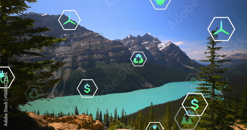 Fototapeta premium Showing turquoise glacial lake and rocky mountain peaks in valley, with hexagonal eco icons