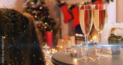 Fototapeta premium Showing two filled champagne flutes on round table by fireplace, with candles, gift, copy space