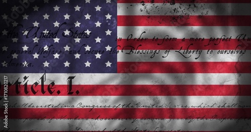 Fototapeta premium Showing weathered American flag with constitutional script overlay and...