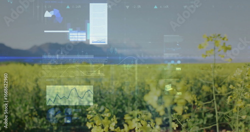 Fototapeta premium Showing yellow crop field on farmland reaching toward mountain range, with AR charts and tables
