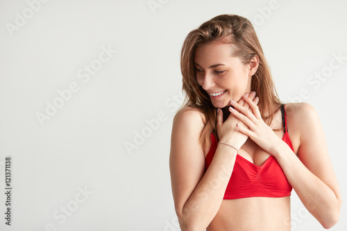 © kegfire, Fototapeta premium shy brunette in red sportswear bra looking to the side at copy space