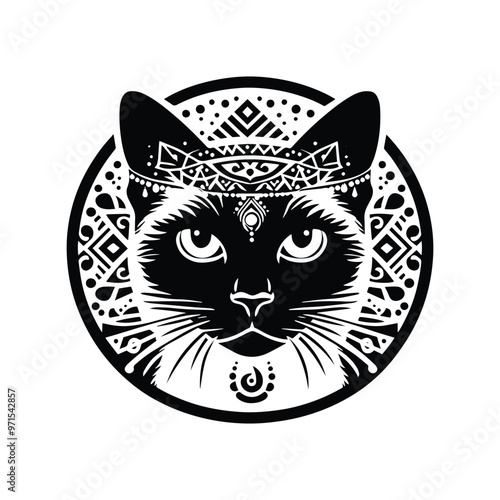 © Cici, Obraz premium Siamese Cat in bohemian black and white silhouette illustration