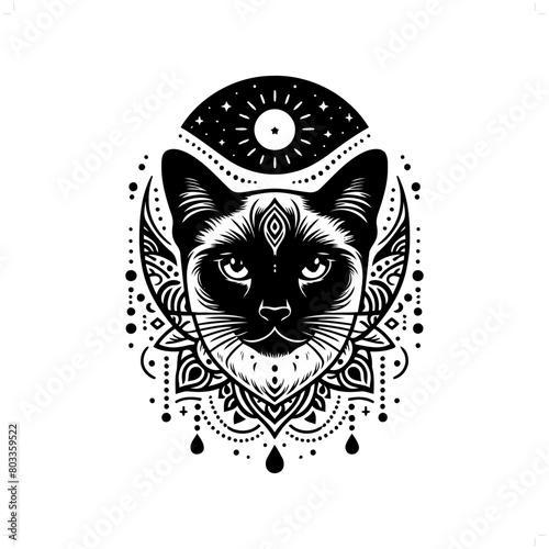 © orion, Naklejka premium Siamese cat silhouette in bohemian, boho, nature illustration