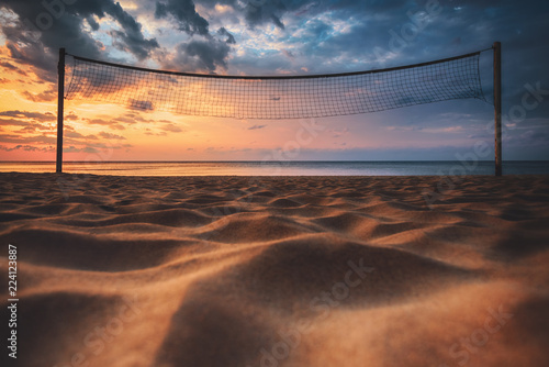 © ValentinValkov, Fototapeta premium Siatkówka siatkowa i wschód słońca na plaży