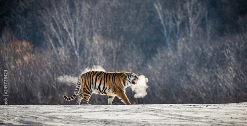 © gudkovandrey, Fototapeta premium Siberian (Amur) tiger walks in a snowy glade in a cloud of steam in a hard frost. Very unusual image. China. Harbin. Mudanjiang province. Hengdaohezi park. Siberian Tiger Park. Winter. (Panthera tgris