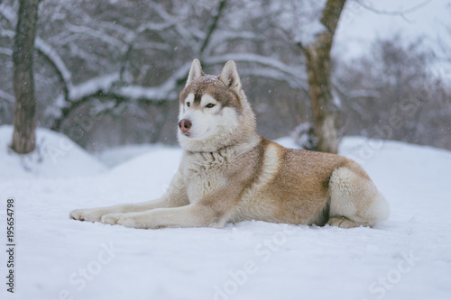 Naklejka premium Siberian husky dog walks outdoors in the snow.