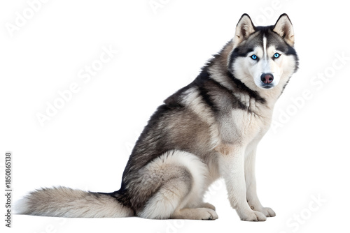 © Kymaka28, Obraz premium Siberian husky dog with blue eyes sitting and looking at the camera. Realistic portrait of a husky isolated on transparent background. Ideal for winter themes, pet brands, and animal advertising.