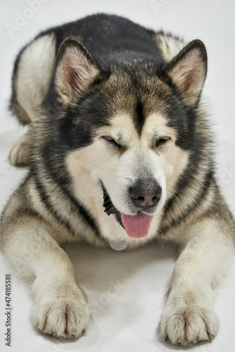 © Svitlana, Obraz premium Siberian Husky dog with closed eyes lying on floor
