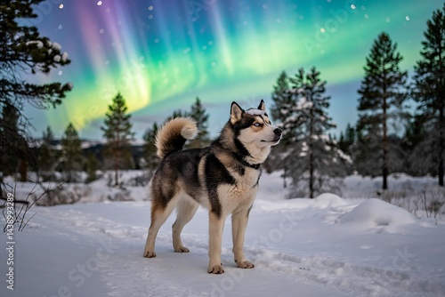 © Wins, Naklejka premium Siberian Husky Howling Under Northern Lights in Arctic Wilderness Snow Landscape