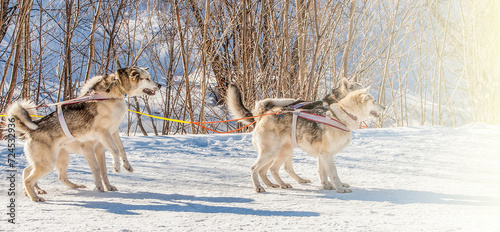© bborriss, Naklejka premium Siberian Husky in harness ready to start on soft sunlight