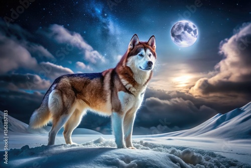 Naklejka premium Siberian Husky Night Photography, Fluffy Dog, Winter Dog, Snowy Night, Rule of Thirds Composition, Dog Portrait, Husky in Snow