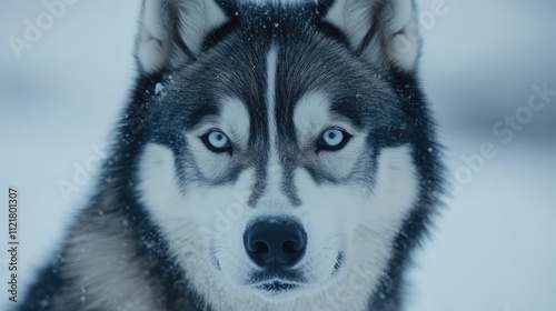 © AugmentArt, Naklejka premium Siberian Husky portrait with striking blue eyes against a soft white background showcasing its distinctive features and coat texture