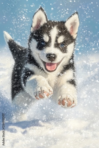 © Milena, Naklejka premium Siberian Husky puppy jumping and running in the snow in a winter field, Generative AI,