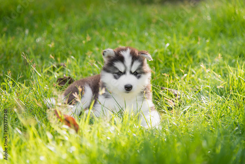© lalalululala, Fototapeta premium siberian husky puppy lying and looking on green grass
