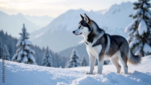 Fototapeta premium Siberian husky standing in snow with snowy mountains and trees in the...