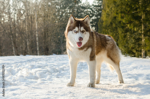 Naklejka premium Siberian husky stands on snow-covered ground in forest. Sunlight highlights...