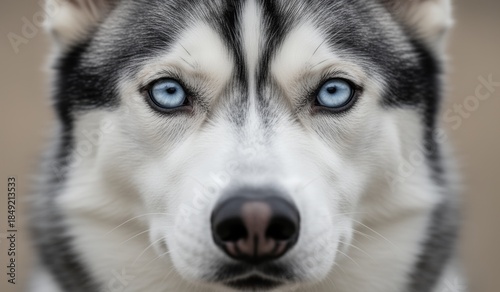 Fototapeta premium Siberian husky stares with striking blue eyes in a soft outdoor setting...