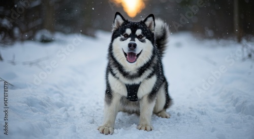 © Matt, Naklejka premium Siberian Husky with black harness in snowy winter landscape
